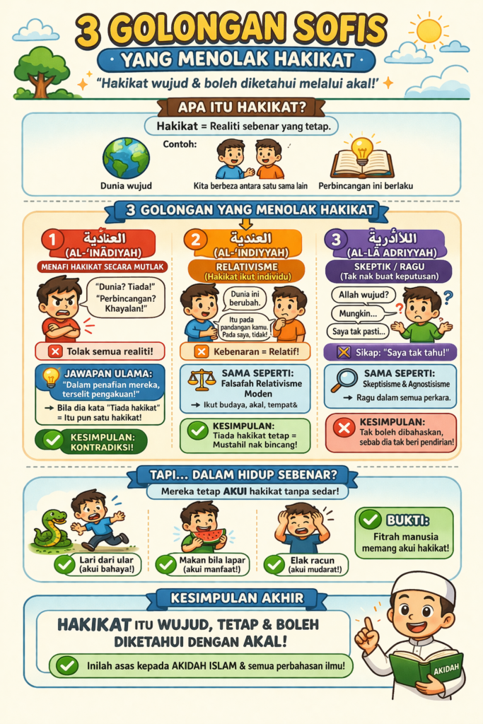 Dalam konteks ini, para ulama membahaskan satu kelompok yang dikenali sebagai السفسطائية (Sofis), iaitu golongan yang menolak atau meragui hakikat. Mereka tidak berada dalam satu bentuk sahaja, bahkan terbahagi kepada tiga aliran utama: العنادية، العندية، واللاأدرية.